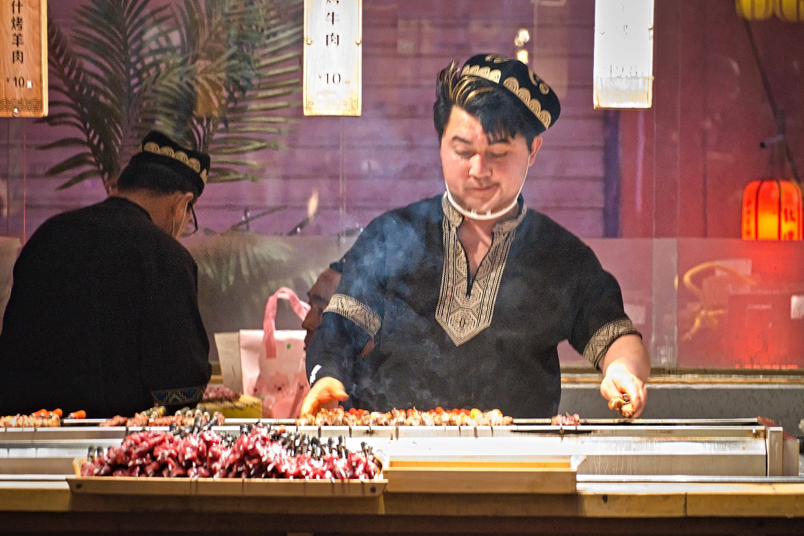 Vendisto rostas viandon en la ĉefa korto de la bazaro. Raportis kaj fotis: Rafael Henrique Zerbetto Facebook: Ĉina Fokuso / China Focus - Esperanto Twitter: El Popola Chinio WeChat: Skani la du-dimensian kodon por legi EPĈ en WeChat