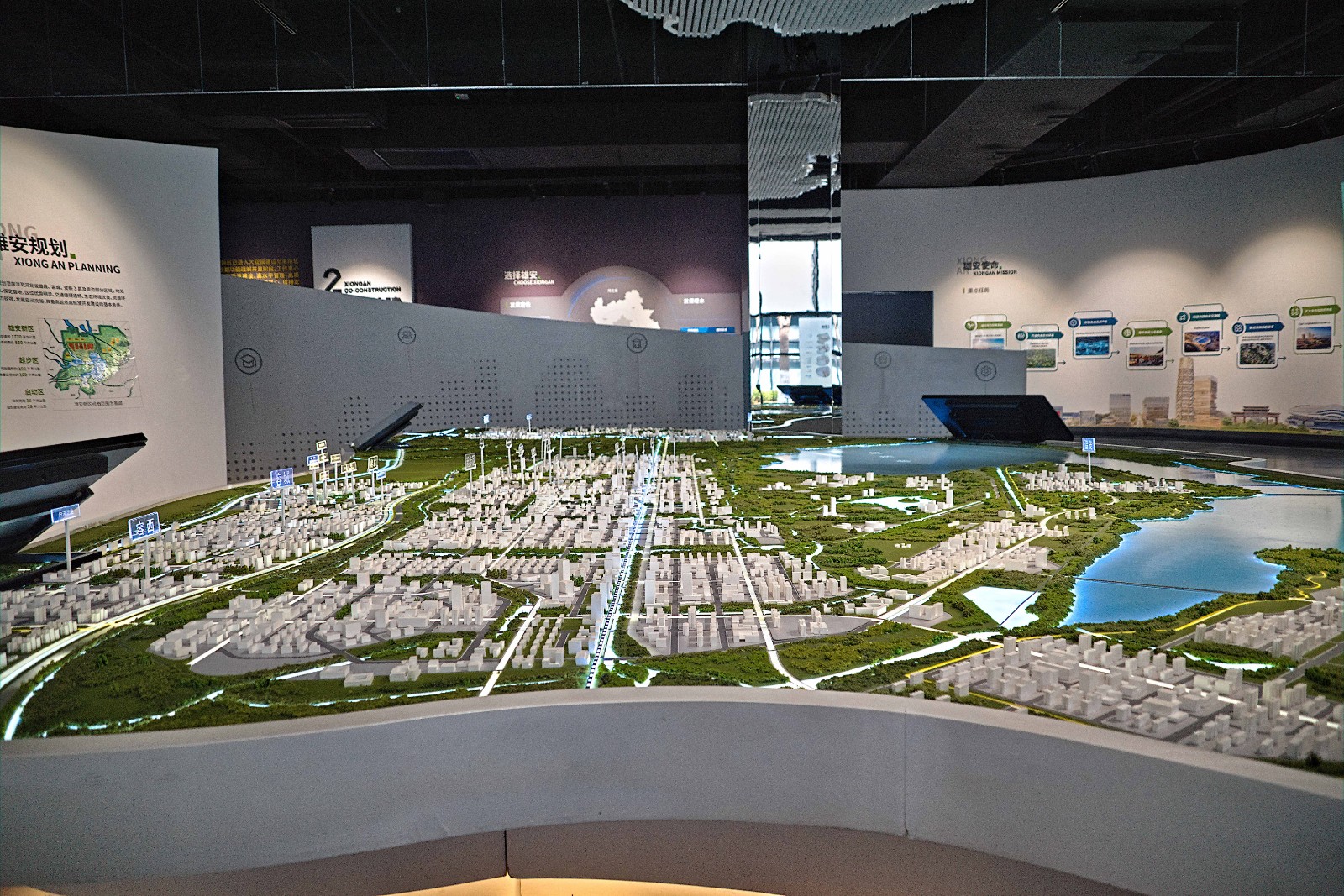 Maketo de la Nova Areo Xiong'an Cetere, Xiong'an havas la specialan statuson de "Nacinivela Nova Areo". Tio signifas, ke ĝi estas ŝlosila nacia projekto komparebla al la Speciala Ekonomia Zono de Shenzhen kaj la Nova Areo Pudong de Ŝanhajo. Tiu speciala statuso donas al ĝia administra komitato pli grandan povon ol tiu de ordinara urba registaro, kadre de ekonomiaj kaj sociaj aferoj. Ĝis 2024, la konstanta loĝantaro de Xiong'an atingis 1.36 milionon da homoj, kaj ĝi altiris pli ol 400 branĉojn de ŝtataj entreprenoj, kune kun centoj da altteknologiaj firmaoj. Sed plejparto de Xiong'an ankoraŭ estas konstruata, kio donas al ĝi aspekton similan al tiu de Braziljo en la epoko de ĝia inaŭguro. Mia vizito al Xiong'an Mi jam estis loĝanta en Pekino, kiam prezidento Xi Jinping anoncis la fondiĝon de la Nova Areo Xiong'an, kaj post la inaŭguro de la nova flughaveno Daxing de Pekino, mi malkovris, ke ĝi troviĝas meze de la vojo inter Pekino kaj Xiong'an kaj estas facile alirebla de tie. Tion mi konstatis esplorante pri iro al Xiong'an: estas trajnoj el la Pekina Okcidenta Stacidomo, ne for de mia hejmo, kaj estas ankaŭ trajnoj, kiuj ekiras el tiu flughaveno. Fakte, nuntempe ĉiuj trajnoj haltas ĉe la flughaveno, tiel ke la urbo estas facile atingebla. Atinginte la urbon, la surprizo: grandega stacidomo meze de nenio. En la ĉirkaŭaĵoj konstruado daŭras. Mi sekvis la ŝildojn de la stacidomo por iri al la loko por preni taksion, sed dumvoje laboristo haltigis min kaj klarigis, ke por preni taksion mi devus eliri en la alia flanko. Laboristoj estis tre afablaj kaj helpis min preni taksion, kiu kunportis min al alia distrikto, jam loĝata kaj kun funkciantaj kompanioj. Tie mi vizitis la Centron pri Urboplanado, kie estas detalaj klarigoj pri la koncepto de la urbo, ĝia konstruado kaj la planoj por ĝia estonteco.